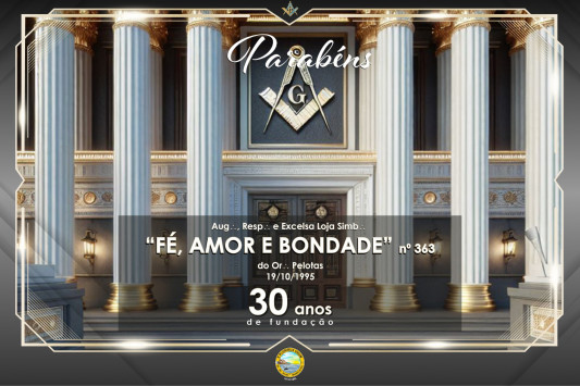 Comemoramos neste domingo os 30 anos de fundação da Aug∴, Resp∴ e Excelsa Loja Simb∴ FÉ, AMOR E BONDADE nº 363, do Oriente de Pelotas...